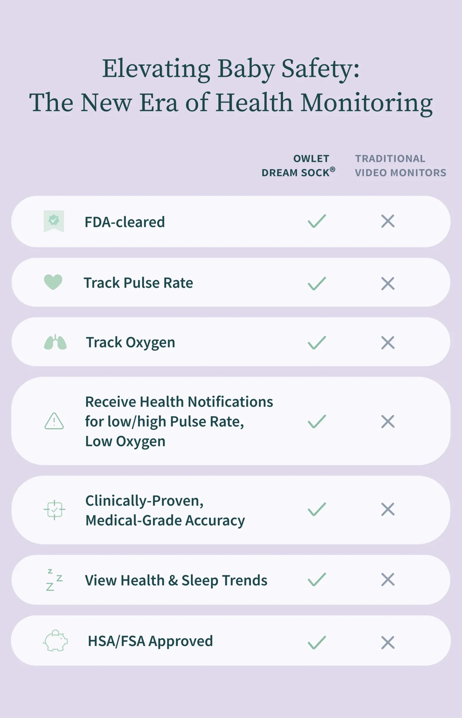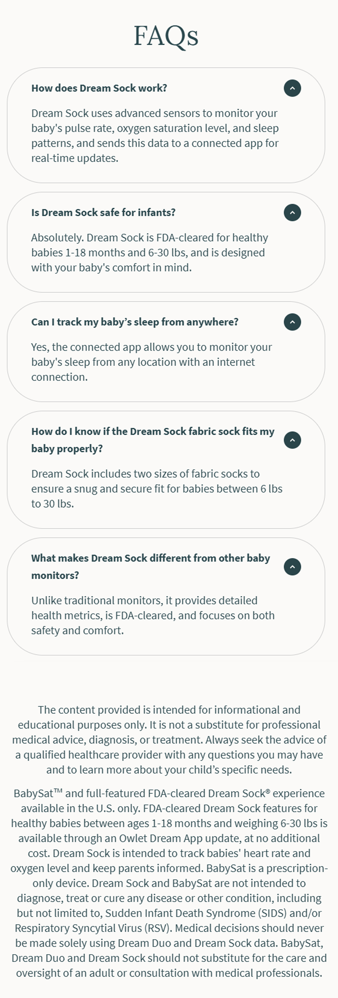 Dream Sock® is the first-of-its-kind FDA-cleared smart baby monitor to offer Live Health Readings and Health Notifications for use with healthy infants between 1-18 months, 6-30 lbs.