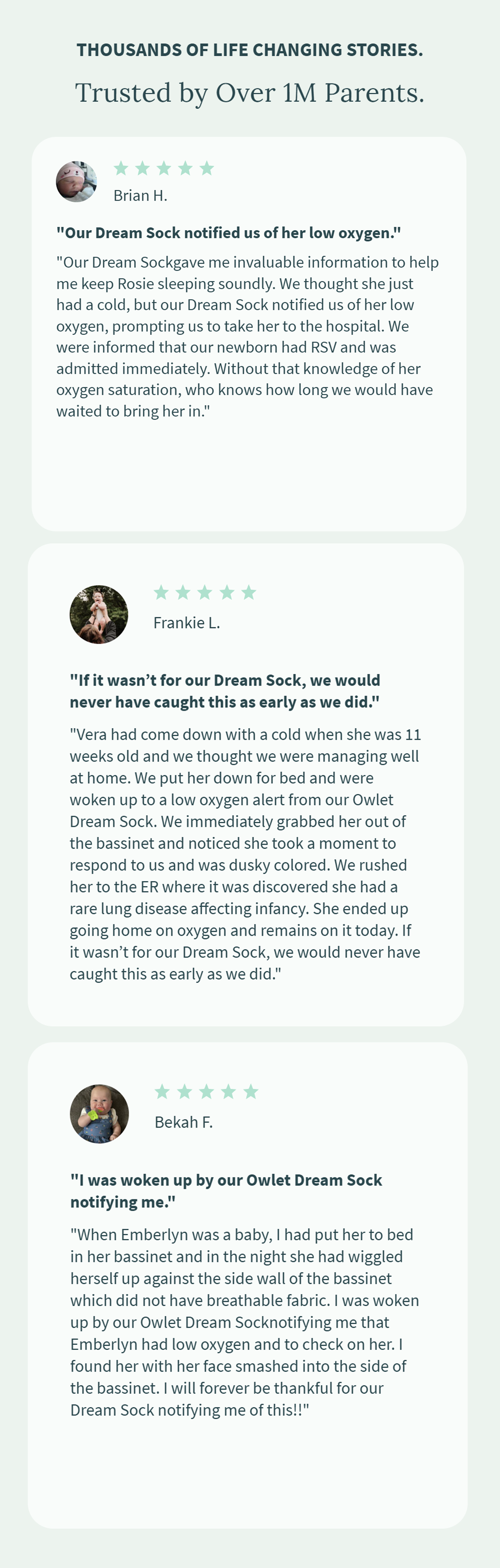 We love our owlet. We bought the previous generation when our daughter had an episode where she stopped breathing and was hospitalized for 5 days. For us it brought comfort and peace of mind. Yes, there are occasional false alarms but after experiencing a real episode where we did not have the Owlet and only recognized what was going on by chance there is no alternative. We recently upgraded to the most recent dream sock for our most recent child who was born 4 weeks premature. I would recommend this product to anyone...no it's not a silver bullet, but for parents looking to have an extra tool to keep their sleeping child safe this product is great.
